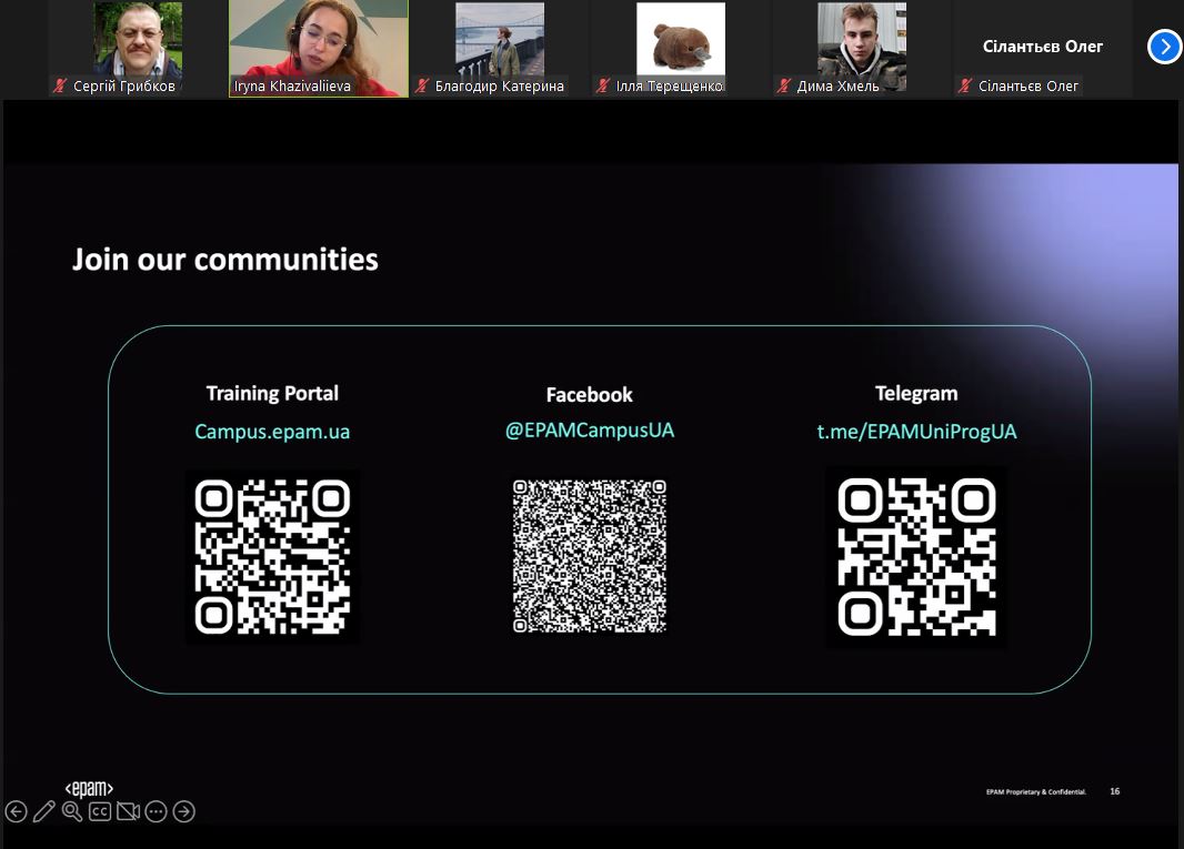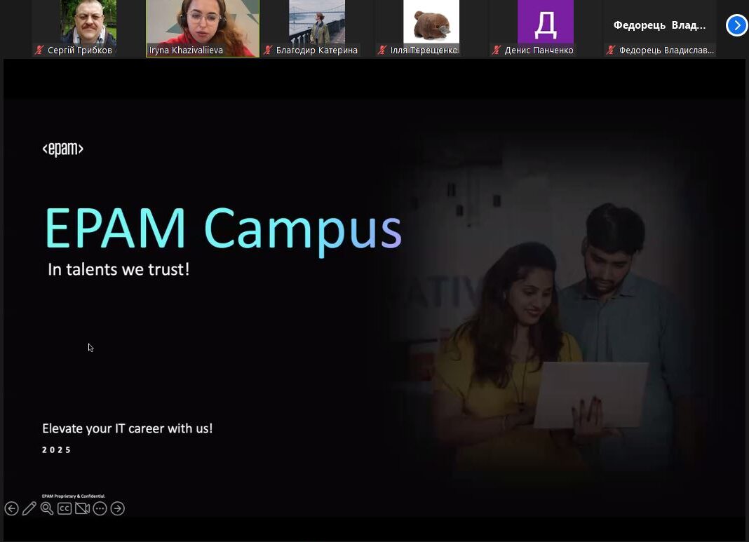 Під час відеоконференції представники EPAM Ірина Хазівалієва (керівниця лабораторії бізнес-аналізу) та Олександр Муляр (Lead Software Quality Engineer) розповіли здобувачам бакалаврату та магістратури НУХТ про свою компанію та особливості роботи над ІТ-проєктами.