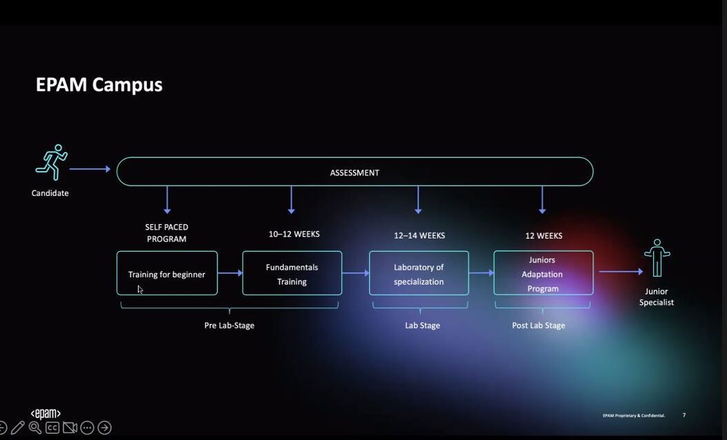 Зокрема пані Ірина поділилася інформацією про історію компанії та сучасні проєкти, над якими працює EPAM, про етапи навчання та стажування новачків у кампусі, а також про тестування для визначення пріоритетних напрямів кар’єри у сфері ІТ.